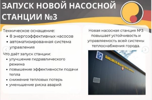 Также введена в эксплуатацию современная насосная станция №3 с энергоэффективными насосами и автоматизированной системой управления, что обеспечивает более стабильное распределение тепла и повышает эффективность работы системы.